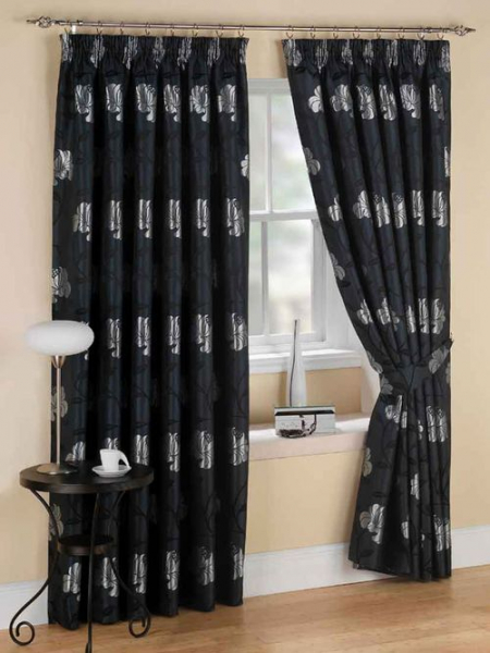 Ваши шторы не обязательно должны быть однотонными. Черный узор будет богато смотреться, если выдержать общий стиль комнаты.