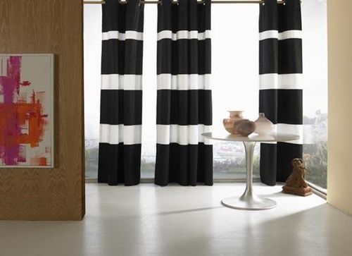 Лучшего эффекта можно добиться, используя для декорирования комнаты шторы с чередующимися черно-белыми полосами. К тому же вертикальные полосы способны зрительно приподнять потолок, что немаловажно для низких помещений. А вот горизонтальные полоски позволят расширить пространство. Интересного результата можно добиться с использованием крестообразного сочетания черного и белого цвета.