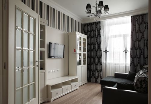 Дизайнеры подбирают ахроматические цвета и совмещают их с другими не совсем яркими оттенками. Если занавесы черные, другой декор (например, стены) должен быть выполнен в белом цвете. А вот мебель характеризуется как в светлых тонах, так и более темных.