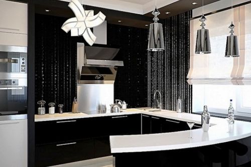 Стоит отметить и то, что шторы для чёрно-белой кухни тоже стоит подбирать из лёгких тканей. Таким образом, кухня станет роскошной и немного таинственной. А где ещё, как не на ней, творится таинство приготовления вкусных блюд? Обои для кухни стоит подбирать не менее тщательно, чем для спальни. Обои для кухни должны быть светлыми, тёплыми и желательно без рисунка, если вы планируете занавески тёмного оттенка на окнах. Это не спальня, в ней неуместны портьеры и другие тяжёлые шторы.