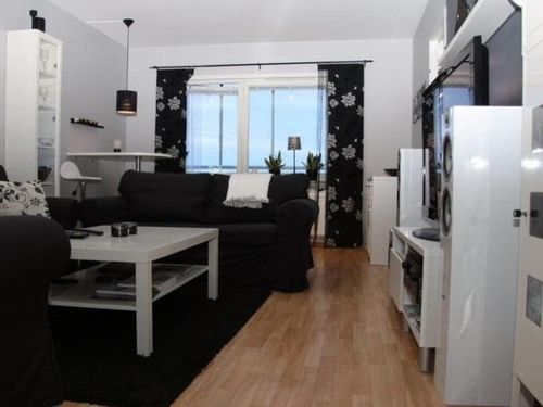 - Что до гостиной комнаты, так здесь черные занавесы могут создавать впечатление темного пятна. Чтобы избавить гостей от уныния или просто плохо настроения, разбавьте темную атмосферу предметами мебели. Мы говорим про различные столики, полки и т. п.