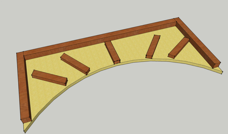 Теперь можно устанавливать дугообразные профили, прикрепив их предварительно с одной стороны каркаса. Затем прогнуть по краям установленного арочного элемента из гипсокартона, сразу прикрепляя саморезами. В последнюю очередь крепится второй край к каркасной стойке. Чтобы увеличить надёжность мастера рекомендуют смонтировать по всей площади уложенного ГКЛ несколько профилей, которые соединяют между собой горизонтальные направляющие и дугообразные элементы. Схема расположения должна получиться приблизительно вот такой, как показано на рисунке снизу.