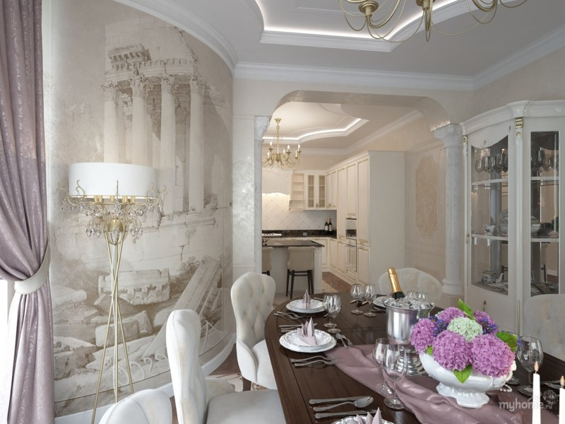 - Яркие обои с золотым или серебряным рисунком, наклеенные на колонны в круглой арке, подчеркнут великолепие интерьера в византийском, греческом, викторианском стиле.