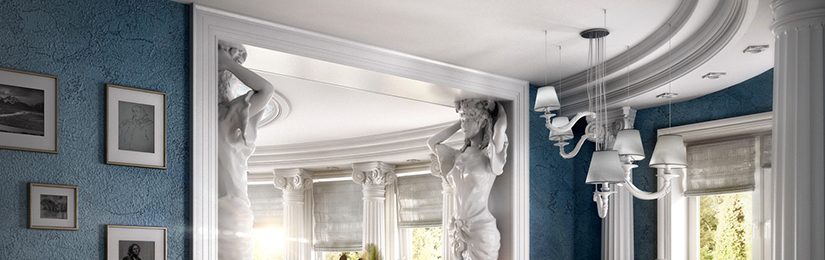 Просторные парадные залы апартаментов в античном стиле украшают гипсовые статуи. Позы гипсовых фигур могут быть самыми различными – сидящими на стуле или в кресле, помещенные в специально созданной нише, размещенными на стене в обрамлении дорогого багета.