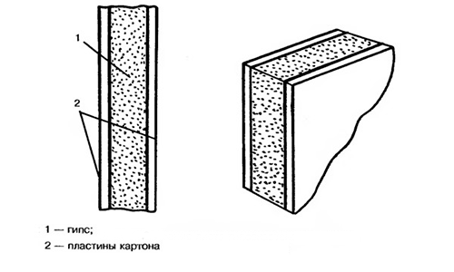 Структура листа гипсокартона: 1- гипс, 2 — картон.