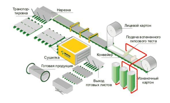 Гипсокартон представляет собой сэндвич-панель, которая состоит из двух слоев картона и прослойки гипса. В процентном соотношении гипсокартон выглядит следующим образом: 93% — гипс, 6% — картон, 1% — дополнительные материалы. Для дополнительной плотности в гипс подмешивают стекловолокно и специальный армирующий состав, а для плотного прилегания картона к гипсу применяют специальные клеи. Правда их состав является, как правило, коммерческой тайной компании-производителя. Сам картон, который используется при производстве гипсокартона, должен обладать определенными свойствами: