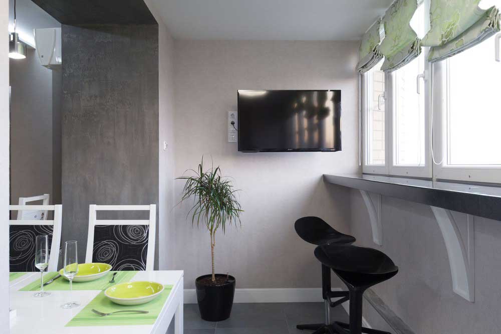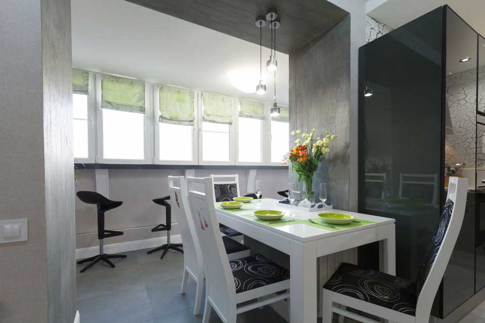 Если кухня 8 кв м предполагает наличие балкона, совершают перепланировку и присоединяют пространство, превращая его в зону отдыха и обеденный сегмент или частично выносят на лоджию мебель, холодильник и другие приборы. Перед этим проводят качественное остекление и утепление балконного помещения.