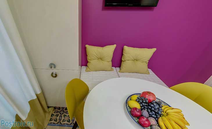 Активно используем углы и угловые модели. Вместо дивана можно поставить небольшой мягкий кухонный уголок.