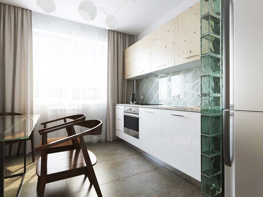 Чем меньше фактуры в отделке такой кухни, тем лучше. В идеале, следует использовать один-два материала, близкие по фактуре, в единой цветовой гамме. Чем проще выглядит помещение, тем оно кажется больше и просторнее.