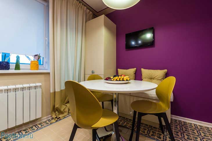 Мягкие уголки все еще популярны, и это легко объясняется комфортом и уютом, которые обретает кухня с таким элементом мебели. К сожалению, для кухни площадью 8 квадратных метров, такие модели редко подходят из-за своей громоздкости. На фото ниже адаптированный вариант, в котором используется не полноценный уголок, а маленькие диванчики и круглый стол. Плюс круглого стола в отсутствии острых (и травмоопасных) углов и ножек, которые сужают пространство. Кроме того, круглый стол всегда являлся символом уюта.