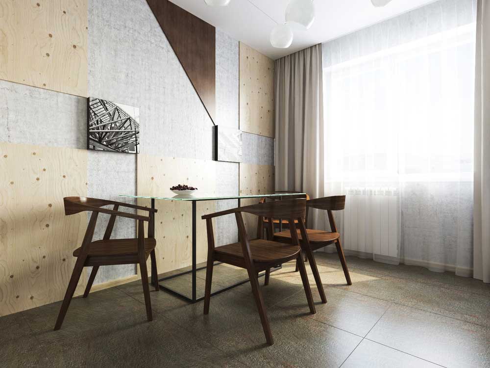 - Декоративный бетон — прекрасный способ отделки стен в кухне 8 км метров при обустройстве стиля хай-тек и минимализм. Бетон можно покрасить, либо оставить его натуральный цвет, который отлично впишется в индустриальный дизайн.