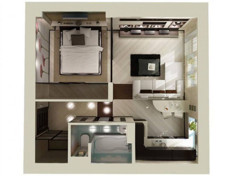 Если имеется желание, то вторая комната может быть разделена на две части, за счет перегородки из гипсокартона, что позволит разделить рабочую и спальную зоны. Чтобы в спальню проникал свет, перегородку достаточно поднять на высоту не больше 1,5 метра.