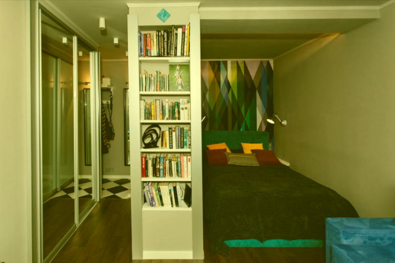 Ставим дополнительную перегородку, отделяющую комнату от коридора. Таким образом получается довольно обширное по размерам помещение, которое можно использовать как кладовку, а можно превратить в гардеробную. Второе помещение — длинное и узкое — разбивается на две зоны: спальню и гостиную при помощи легкой перегородки из гипсокартона или другого листового материала.