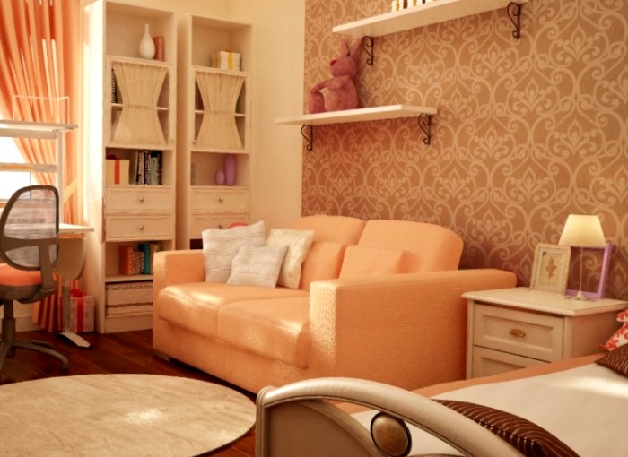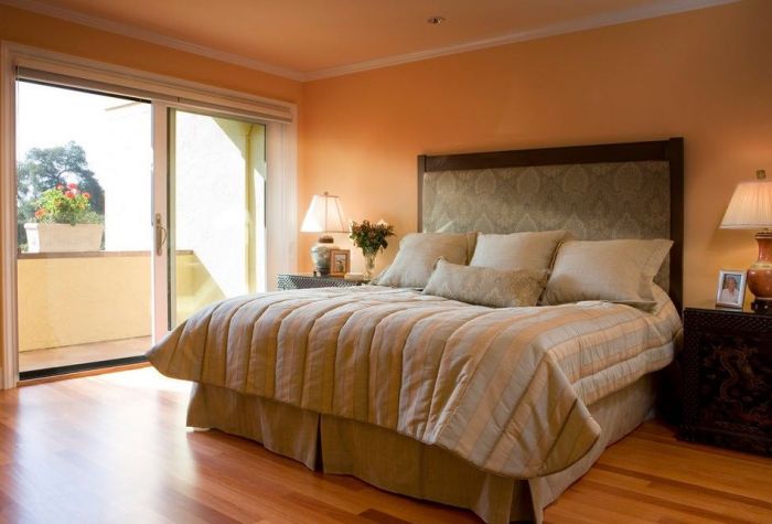 Персиковые покрытия могут быть в таких комнатах яркими акцентами или просто фоном. В последнем случае лучше выбрать более светлый цвет. Ярким акцентом могут стать обои с узорами. Чтобы сохранить атмосферу уюта, лучше сделать так, чтобы все другие элементы в спальне были светлыми (рекомендуется выбирать теплые тона).
