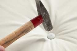 Чаще всего недорогие двери обиты декоративным покрытием из дерматина, соединенного с мебельными гвоздями. Вытягиваем за шляпки гвозди пассатижами, после этого снимается покрытие двери по всему периметру.
