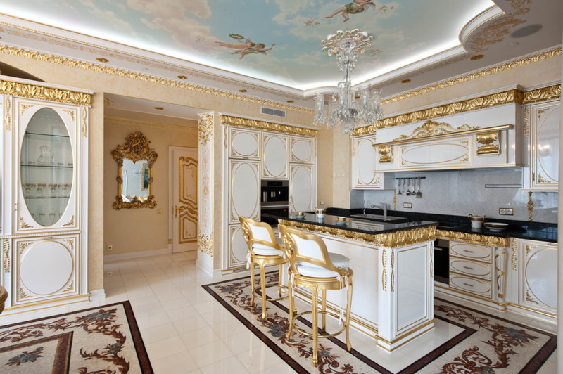 Потолок часто окрашивается в белый цвет и дополняется лепниной или другими элементами декора. Опираясь на технические достижения, в элитной кухне активно применяется светодиодная подсветка потолка и пространств под верхними полками. Большую роль играют и потолочные плинтусы – они поддерживают его безупречную геометрию.
