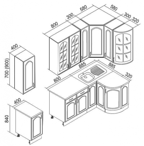 - по ширине угловые конструкции обычно производятся от 900 мм. А вот ширина фасадов рассчитывается согласно геометрической формуле равнобедренных треугольников – она равна 130 сантиметрам;