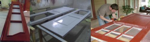 После того как были выполнены подготовительные работы, а полотно выровнено с помощью шпаклевки или другого материала, переходят к нанесению финишного покрытия. Процесс покраски следует проводить в хорошо проветриваемом помещении или на улице в сухую солнечную погоду. Если выполняется реставрация деревянной двери своими руками, следует придерживаться инструкции: