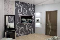Выгодно привлечь внимание к такому объекту поможет контрастное сочетание разнофактурных обоев. Для углубления предпочтительнее выбирать динамичные сюжеты 3Д картин или масштабных фотографий на холсте. Остальное пространство декорируется подходящим по цвету полотном спокойных оттенков.