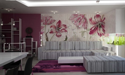 Способ применим тогда, когда этому благоприятствуют размеры зала и у хозяев есть желание оформить комнату неординарно. Радует глаз тандем цветочные мотивы и полосы, растительный орнамент и цветы.