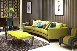 Зонирует помещение. Зал не всегда является только комнатой для приема гостей. Здесь обустраивают обеденную зону, уголок для детских игр или кабинет. Разделить визуально комнату на функциональные зоны поможет контрастный цвет и оригинальный рисунок на полотне.