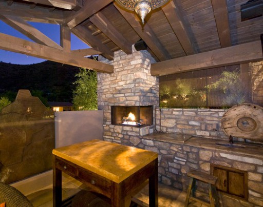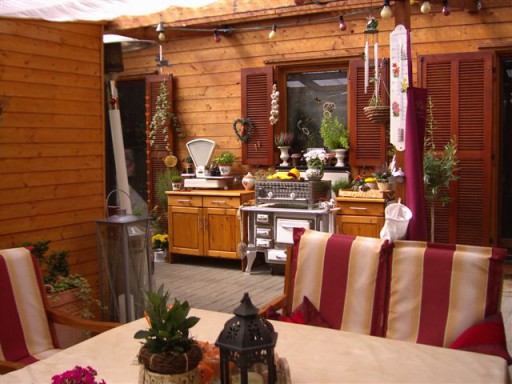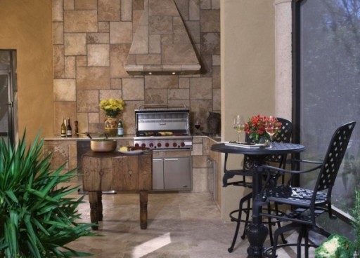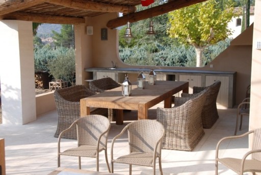 Если вариант открытости не подразумевает крыши над головой обедающих или готовящих людей, то наперед следует позаботиться о герметично закрывающихся крышках над плитой, жарочной панелью барбекю. Не помешает небольшой зонтик или навес над раковиной. Мебель обычно выносят либо старую, либо из таких материалов, что не пострадают от сильного дождя или утреннего тумана с холодными росами.