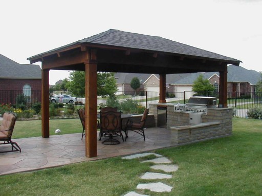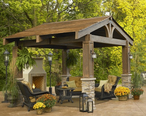 Беседка с барбекю дает возможность жарить шашлык на природе в любой момент, когда вам этого захочется. Печь, изготовленную из камня или огнеупорного кирпича, обычно устанавливают в задней стене, чтобы кулинарное действо не препятствовало домочадцам перемещаться между беседкой и домом.