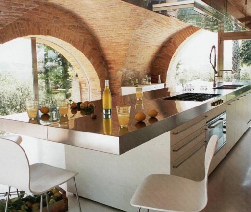 5) Используйте светлые и свежие тона в оформлении летней кухни. Светлые стены, вплоть до белоснежных, кухонная техника с блистающими металлическими поверхностями, лимонно-желтые и небесно-голубые салфетки, скатерти, легкие тюлевые шторы.