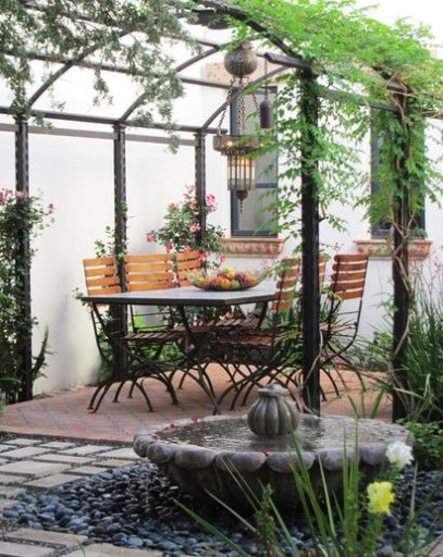 Нередко используются для подчеркивания стиля патио декоративные элементы в виде навесных цветов, водопадов, фонтанов, каминов и других элементов декора. Патио любой сложности можно реализовать своими руками, главное, предварительно решить несколько задач: