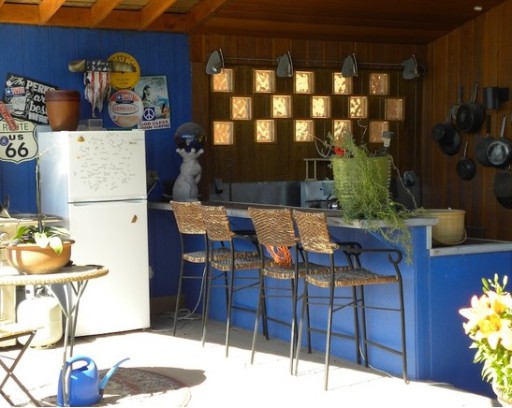3) Не оставляйте в стороне буйство красок и стилей. Летняя кухня может быть яркой, смелой и веселой, включите в дизайн летней кухни дерзкие цвета и узоры. В ином случае спасут красочные аксессуары. Сочетайте модели мебели контрастных цветов и стилей, развешивайте забавные кухонные полотенца и фартуки с прихватками.