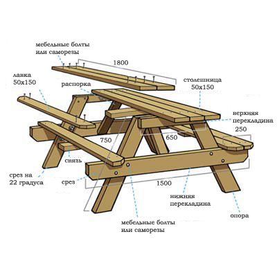 Если вы планируете сконструировать деревянный стол для дачи своими руками, то вам можно предложить следующую схему действий:
