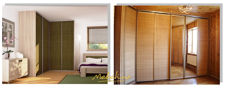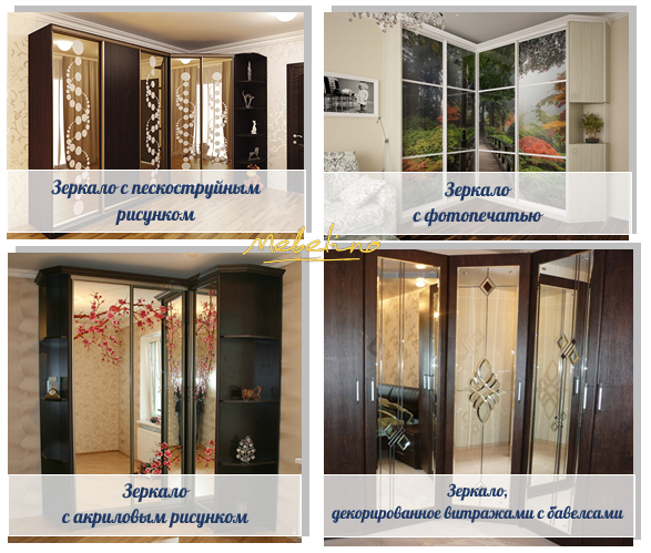Внешний вид углового шкафа купе зависит от того, как оформлены двери. Именно они обращают на себя внимание. Делают их из: