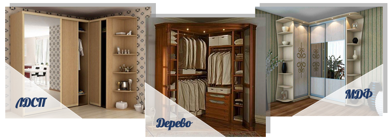 Материалы, которые используют при изготовлении углового шкафа-купе, ничем не отличают от тех, из которых производят всю мебель, это: ДСП, МДФ и дерево (оно не находит широкого применения из-за большого веса и сложности декорирования). Более часто используется ДСП, на которую можно наносить ламинат любой фактуры и расцветки. К примеру, можно нанести рисунки с растениями, графикой, имитировать дерево и т. д. Некоторые конструкции имеют закругленные края (такие шкафы производят из МДФ).