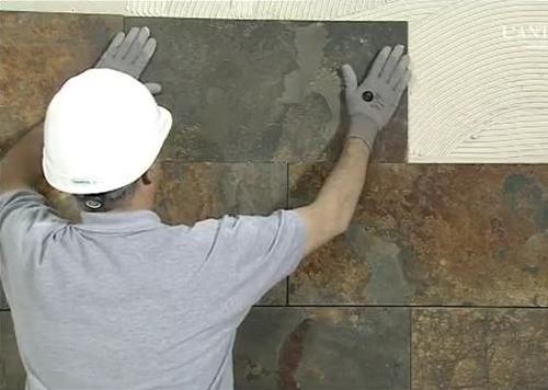 Следующим этапом в укладке природного камня является выбор и подготовка клеящего состава. В этом деле без внимательности также не обойтись. Для качественной укладки натурального камня необходимо приготовить два состава клея – один густой, другой более жидкий. Жидким клеем нужно смазать тыльную поверхность укладываемого камня, а густой нанести непосредственно на саму стену. Цель первого раствора состоит в том, чтобы смесь проникла как можно глубже в мелкие поры камня, а назначение второго клеящего состава состоит в том, чтобы удержать этот материал на вертикальной поверхности стены. Жидкий клей можно заменить специальной мастикой, уже готовой к использованию.