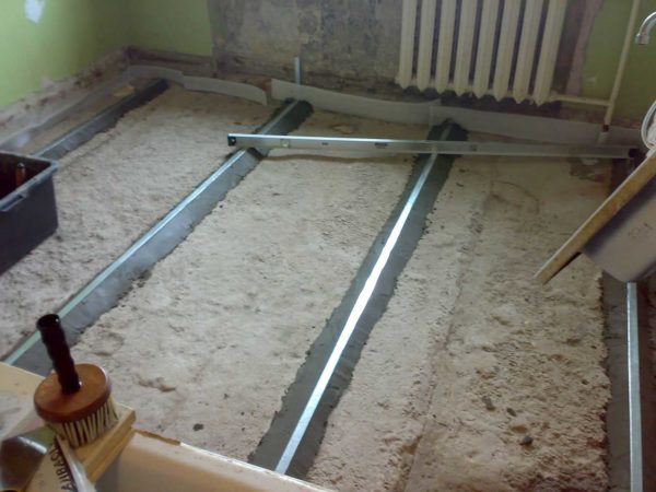 Без установки направляющих ровность стяжки будет под большим вопросом. Пренебрегать маяками не стоит, благо есть из чего выбрать. Наиболее просты в применении – реперы. Надо только научиться ими пользоваться. Но если не хочется на них тратить деньги, то можно воспользоваться вариантом с профилем для гипсокартона, уложенным ребрами вниз. Он потом легко вынимается из бетона, а образовавшиеся щели без проблем затираются.