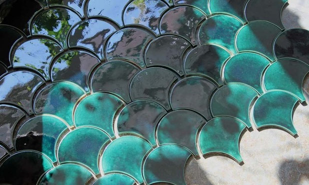 Плитка нестандартной формы — «чешуя», круглые элементы и многоугольники — отдушина для дизайнера. Другой вопрос, что это решение не для скромного бюджета. Во-первых, такая плитка чаще всего «дизайнерская», а значит, вы платите не только за материал, но и за бренд. Во-вторых, каждый второй плиточник скажет вам, что она «бракованная» из-за разницы форм и рельефов, и он не знает, как клеить плитку на стену. Так что в бюджет придется заложить и работу приглашенного мастера, и потенциальный провал (плитку придется покупать с большим запасом), и большее количество затирки, ведь иногда «сложную» плитку кладут с широкими швами. К тому же у нестандартной плитки часто «гуляют» размеры, а чтобы ее подрезать, придется покупать специальное оборудование.