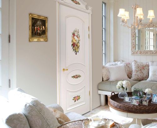 Любителям стиля прованс и кантри при оформлении интерьера стоит сделать выбор в пользу белых межкомнатных дверей. Светлые дверные полотна добавят обстановке тепла и уюта и смогут выгодно подчеркнуть романтичность, лёгкость и некоторую наивность деревенского стиля. Как правило, для производства дверей в стиле прованс или кантри используют массив дерева, но подойдёт и каркасная конструкция, облицованная МДФ. Обычно полотно патинируют либо украшают цветочными композициями.