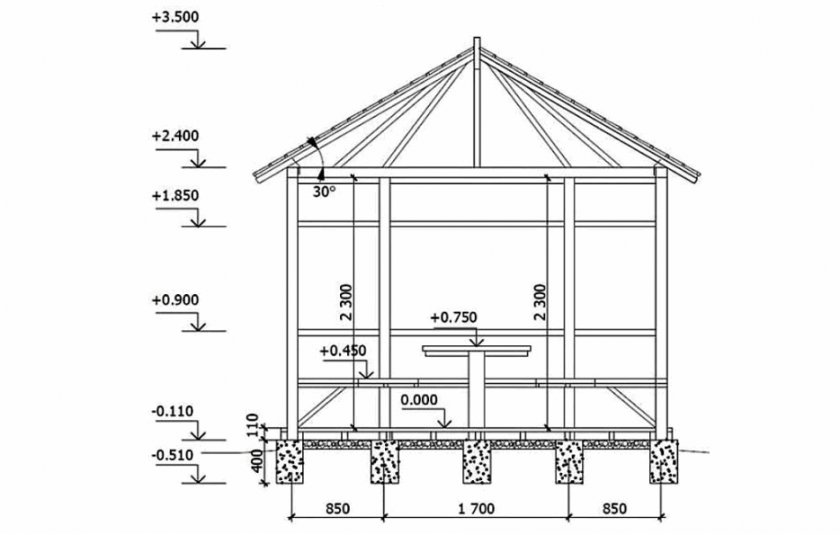 Далее будет подробно рассмотрен процесс возведения летнего павильона с двускатной крышей и площадью 300×540 см. Он состоит из некоторых этапов, которые необходимо выполнять последовательно. Перед началом работ следует провести подготовку инструмента и материалов.