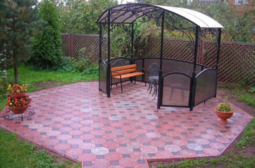 Подготовленная поверхность высыпается песком, слой которого не может быть менее 1 см. Вдоль периметра садового павильона копают неглубокую (10–15 см) канаву и устанавливают в неё боковые бордюры. Вслед за этим начинают укладывать слой тротуарной плитки на песчаную «подушку».