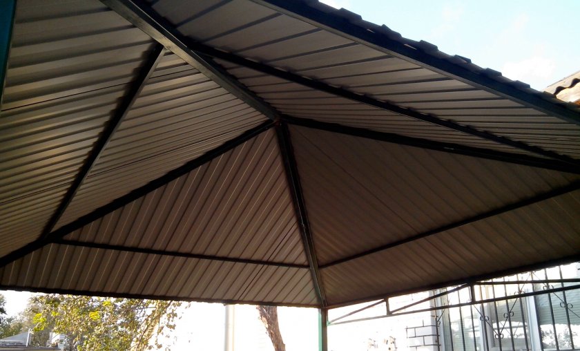 Самая простая конструкция — односкатная. Для неё сваривается четырёхугольная ферма со стропилами, к которым крепится кровельный материал. Однако лучше смотрится двускатная крыша. Её можно собрать из прямых или дугообразных стропил. На прямоугольной беседке неплохо выглядит четырёхскатная конструкция, собранная из двух трапециевидных и пары треугольных скатов. Оригинальная шатровая крыша для беседки собирается из треугольных скатов, соединённых в верхней точке.
