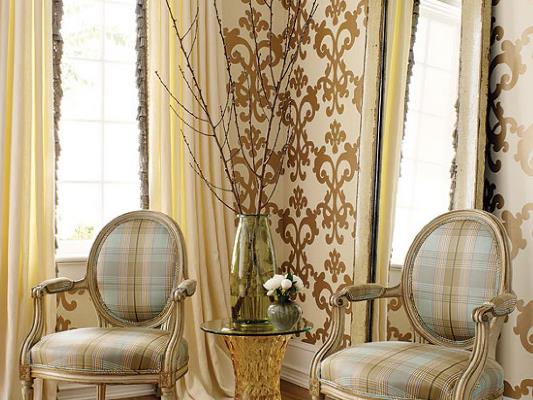 - Текстиль в интерьере не должен совпадать по тону с обоями, так как в этом случае они растворятся в общем интерьере, и деньги, затраченные на отделку из шифона и шелка, можно считать потраченными зря.