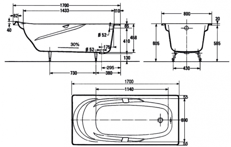 Оптимальная длина – 150-180 см, однако этот показатель напрямую зависит от конкретной модели сантехники и роста членов семьи. Что касается модели ванны, то при наличии в ее конструкции подголовника, для человека с ростом 180 см подойдет ванна длиной 165-170 см. Если же подголовник отсутствует в самой конструкции, например, конструкция – «эконом», то для человека с ростом 180 см выбирается ванна непосредственно по его росту – 180 см. Ниже вы можете видеть стандартные размеры длинны ванны и возможное положение тела при определенной длине.