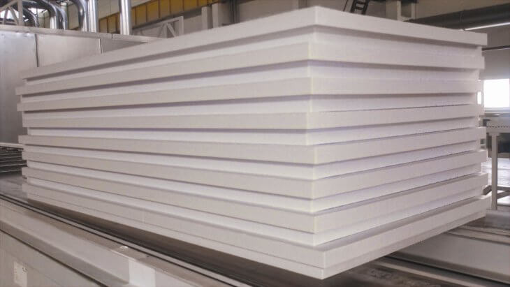 При помощи специального оборудования сырье превращается в пену, из которой, в свою очередь, производятся мелкие гранулы. Эти гранулы в процессе застывания прессуются в пласты нужных форм и размеров, после чего их можно применять не только для утепления домов, но и для иных целей.