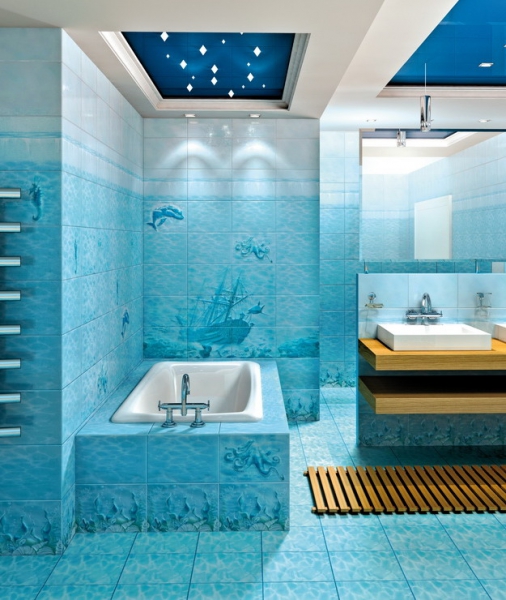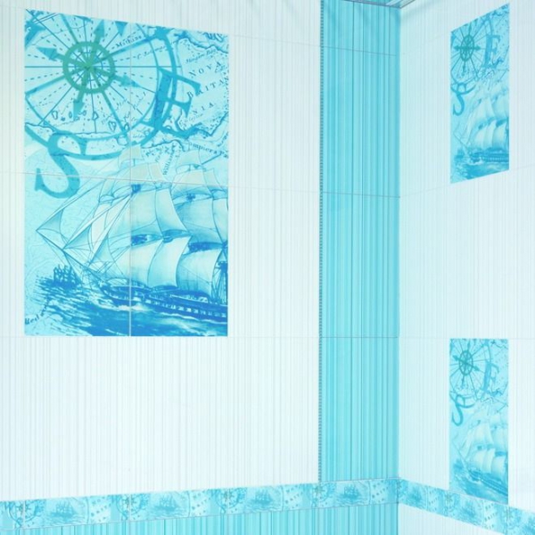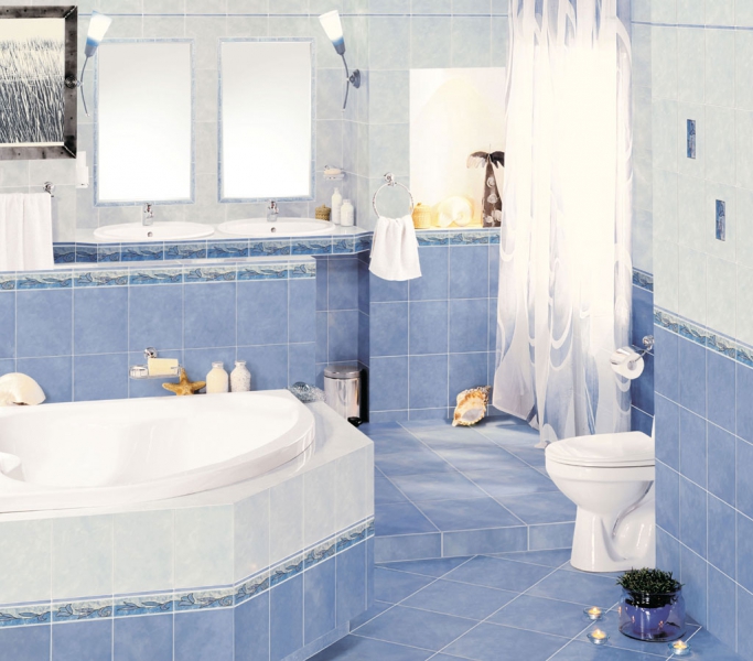- Оформление стен. Оформление стен может быть как однотонным, так и комбинированным, путём использования керамической плитки нескольких оттенков. Если проблема расширения пространства не стоит очень остро, то многие дизайнеры рекомендуют отказаться от глянцевой плитки голубого цвета, так как глянец придаст ещё большую холодность цвету. Естественно, что чем меньше помещение, тем больше светлых оттенков стоит использовать. Более насыщенные и тёмные цвета подойдут для просторных комнат. Беспроигрышно смотрится мелкая мозаика из нескольких оттенков голубого, бирюзового и синего;