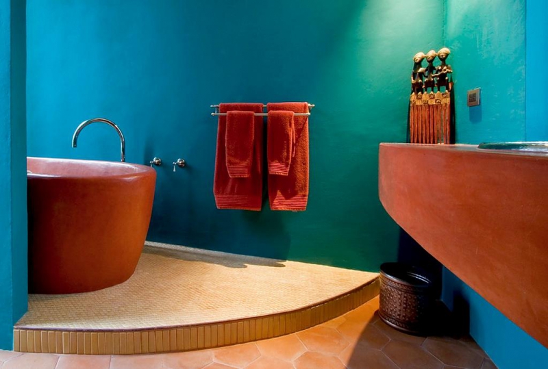 - Если вы оформляете ванную в средиземноморском стиле, то обязательно используйте аксессуары песочного и светло-оранжевого цвета. Хорошо подойдет керамика с этнической росписью.