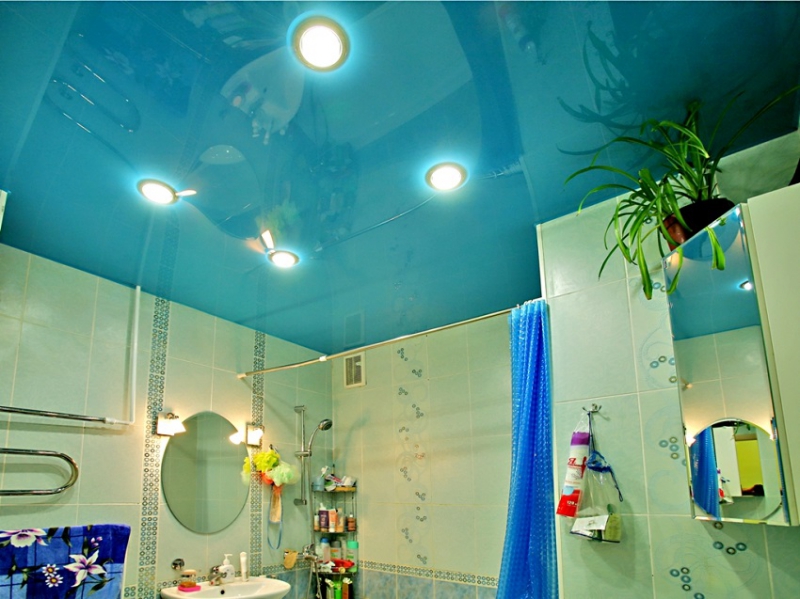 Потолок в ванной комнате, выполненный в синей цветовой гамме, может напоминать голубое небо. Подобие облаков позволит вам расслабиться, однако, уход за таким потолком также будет не слишком простым. Вам стоит воспользоваться специальными моющими средствами и шваброй на длинной ножке. Делать уборку такого потолка стоит как минимум 1 раз в неделю. Иначе он потеряет свою красоту, и не будет иметь такой эффектный внешний вид.