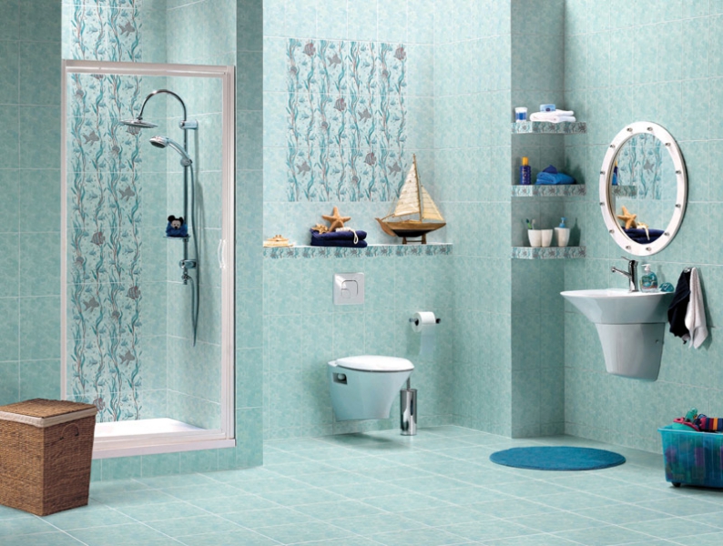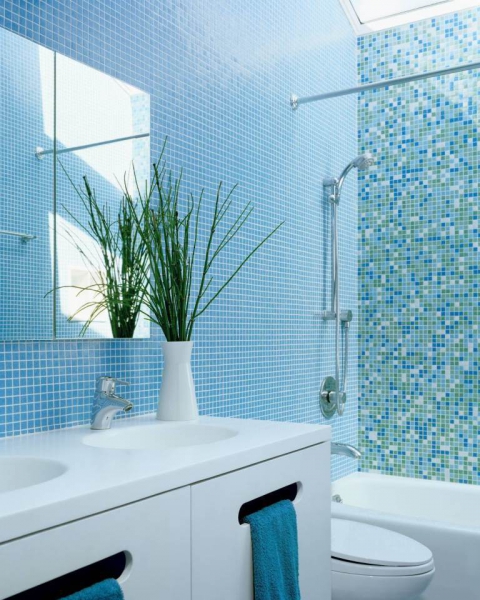 Люди, которые ассоциируют ванную комнату с морем, должны использовать несколько оттенков синего и голубого в интерьере своей ванной комнаты. Мозаичная плитка в зелёных и синих оттенках подойдёт как нельзя лучше. Это сделает интерьер более лёгким и воздушным. Если же вы хотите полностью воссоздать морскую стихию, дополните ванную комнату аксессуарами в этом стиле.