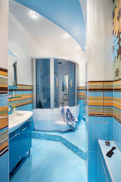 Доминирующим в интерьере ванной должен быть всё-таки светлый оттенок голубого, так как обилие очень ярких цветов может напрягать нервную систему человека при длительном пребывании в комнате.