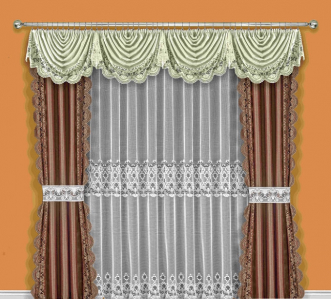 - Набор для гостиной, который включает в себя портьеры, тюль, ламбрекены.