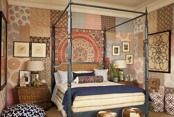 Для зоны игр больше подходят яркие цвета. Можно использовать вставки с изображением героев сказок, игр, мультфильмов. В спальне для взрослых можно поклеить обои отдельно для участка, где находится кровать, остальное пространство задекорировать полотнами с орнаментом.